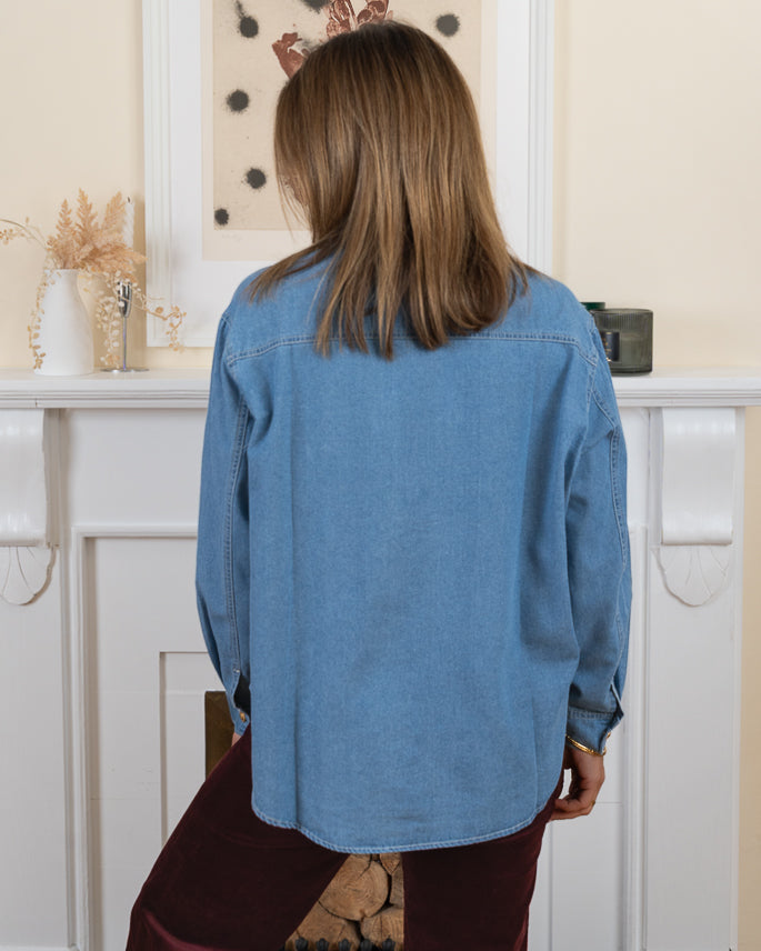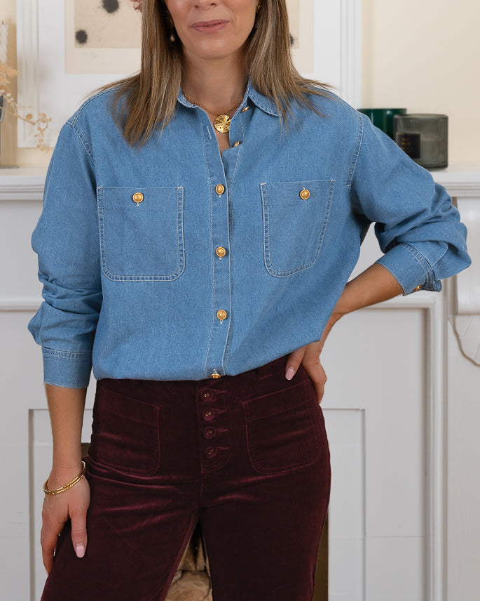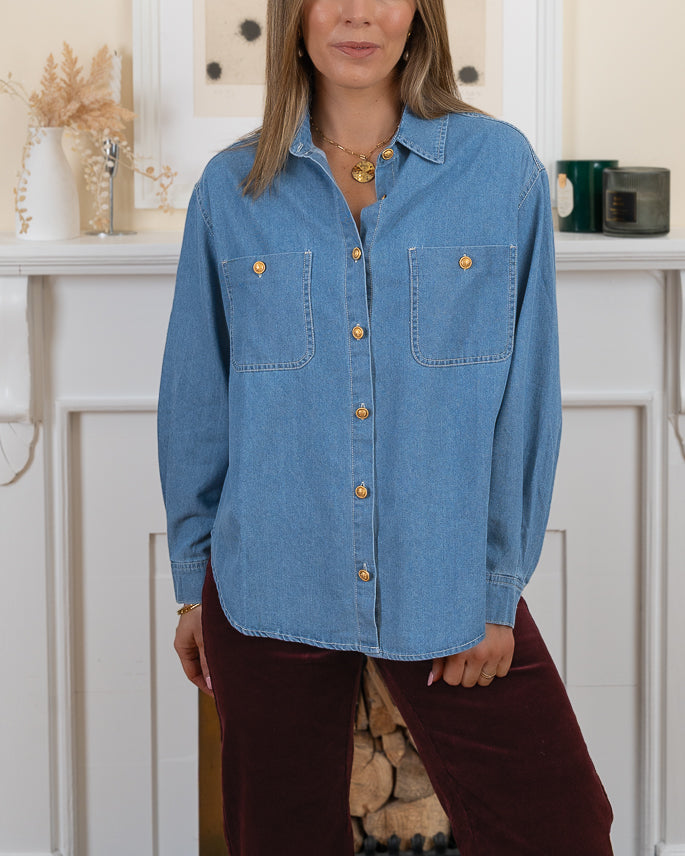 Blue jacket style denim shirt with pockets at the front and gold buttons.