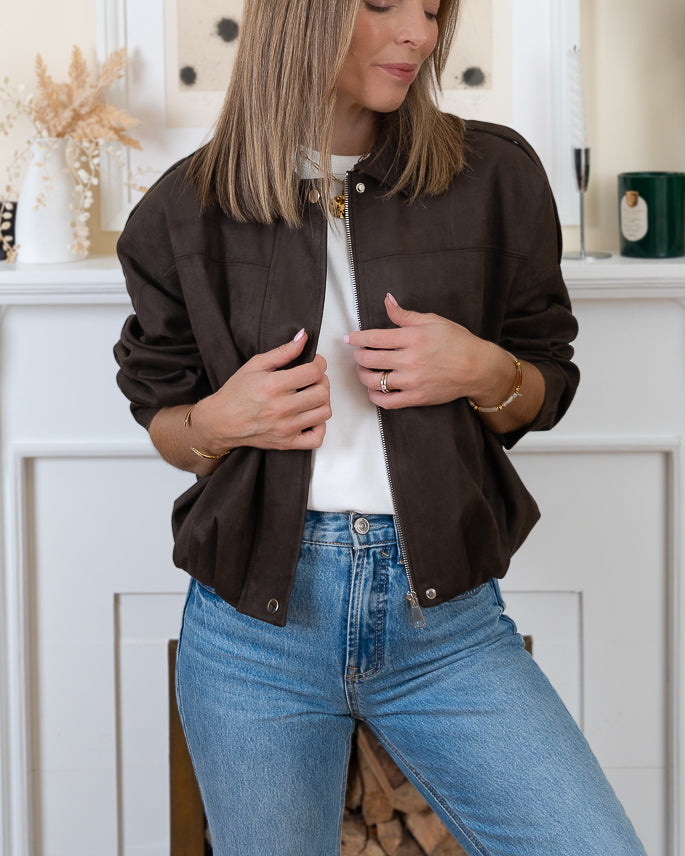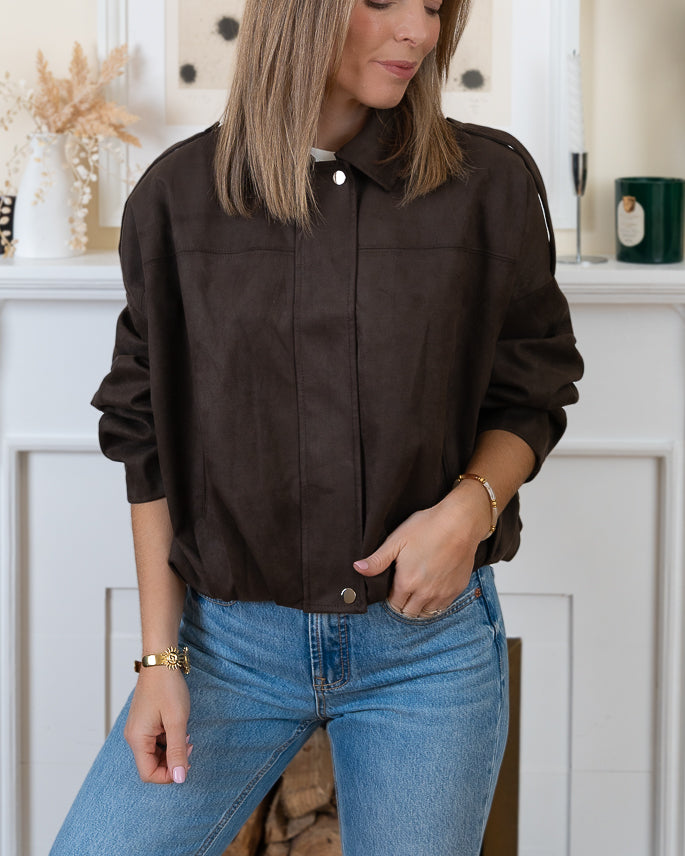 Dark brown suede effect bomber jacket with pockets, buttons and zip closure.