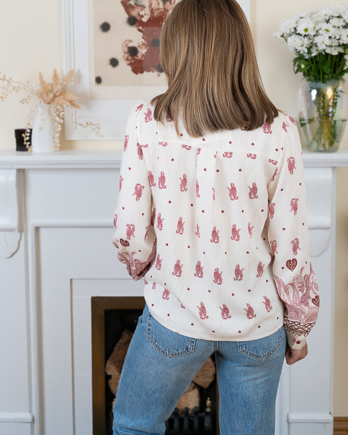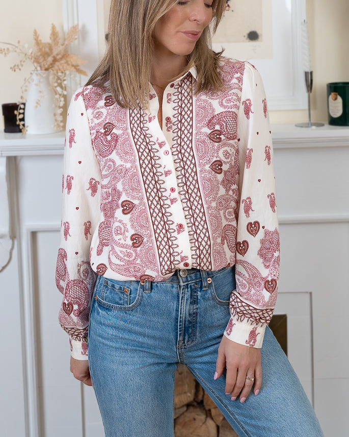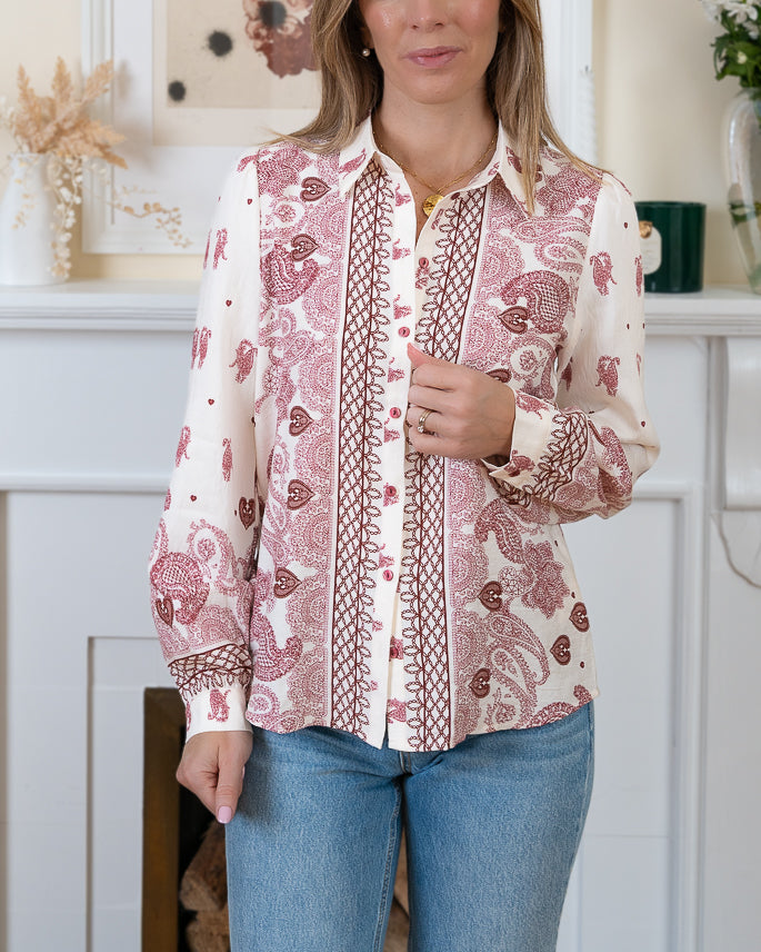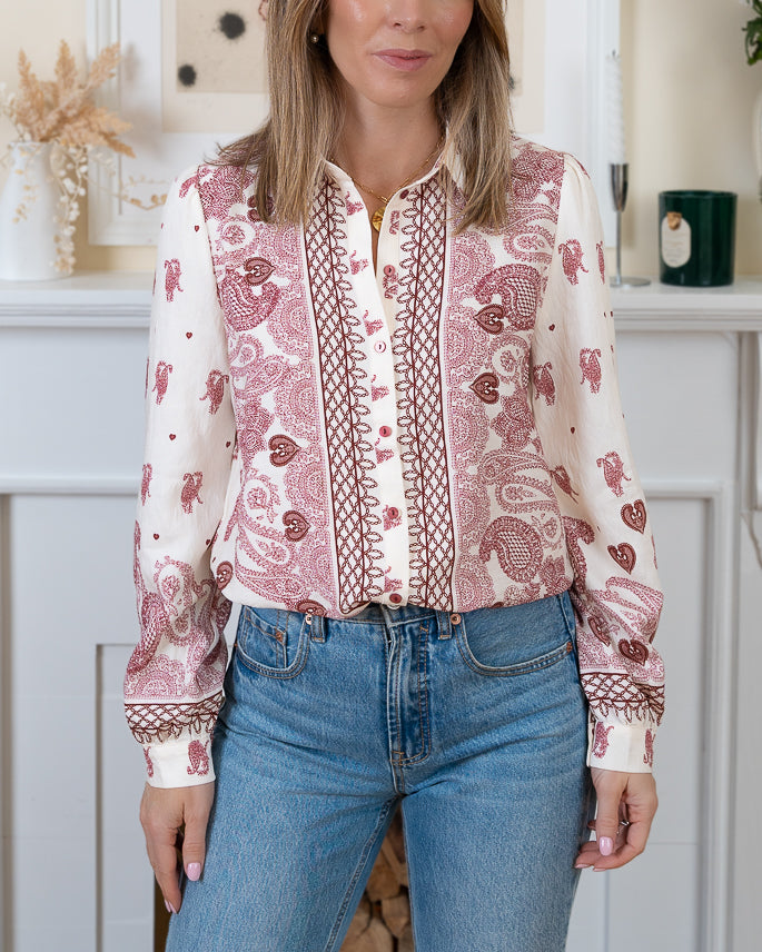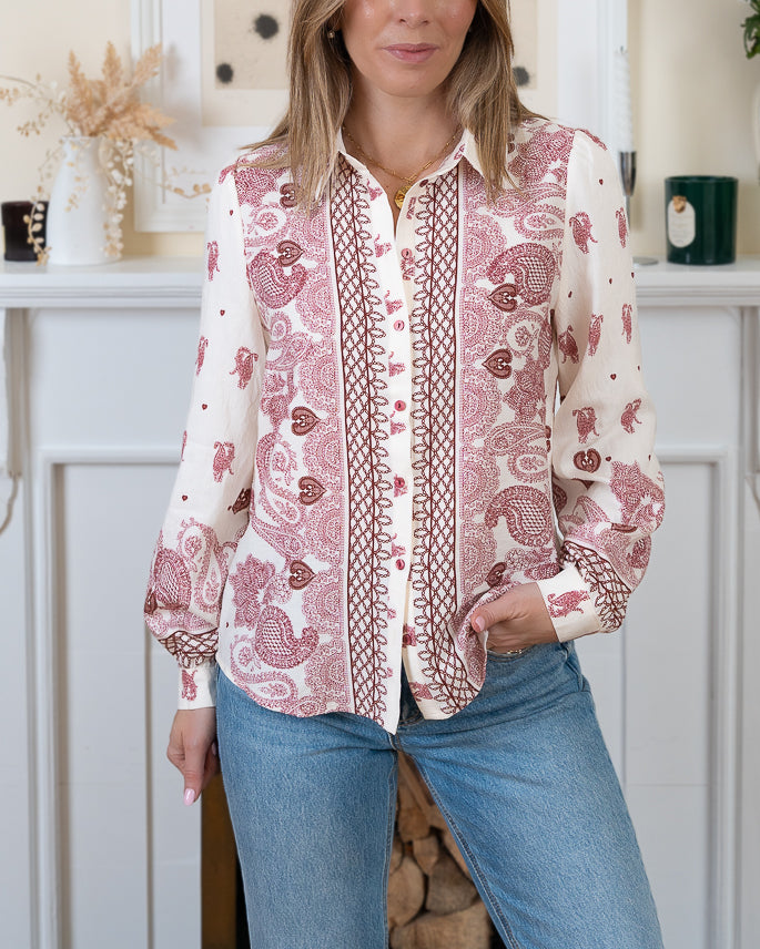 Ecru shirt with a burgundy Parisian print, collars and button closure.