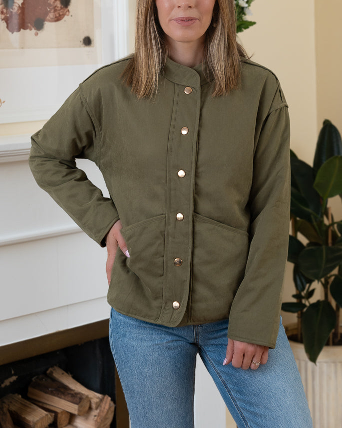 Khaki padded jacket with button closure and pockets.