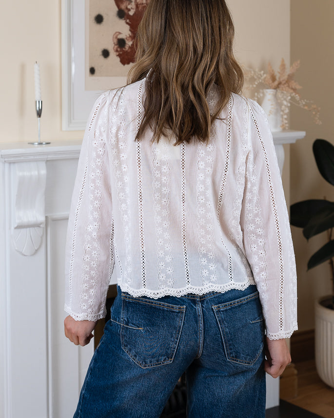 Elegant white blouse featuring delicate lace panels and intricate embroidery details. Designed with a high ruffled neckline and lightweight fabric, it offers a feminine and timeless silhouette. Perfect to pair with denim or tailored pieces for an effortlessly chic look.