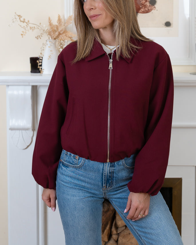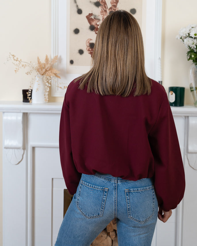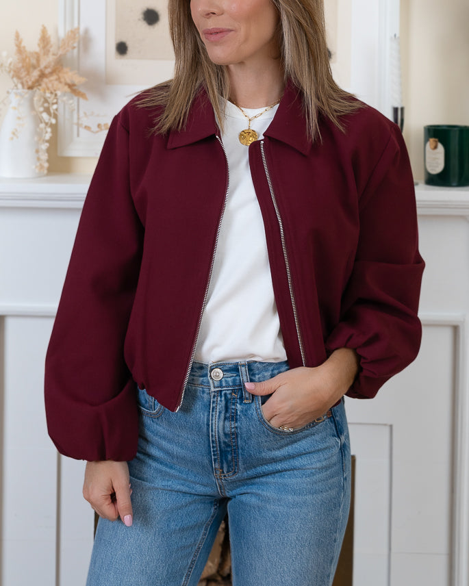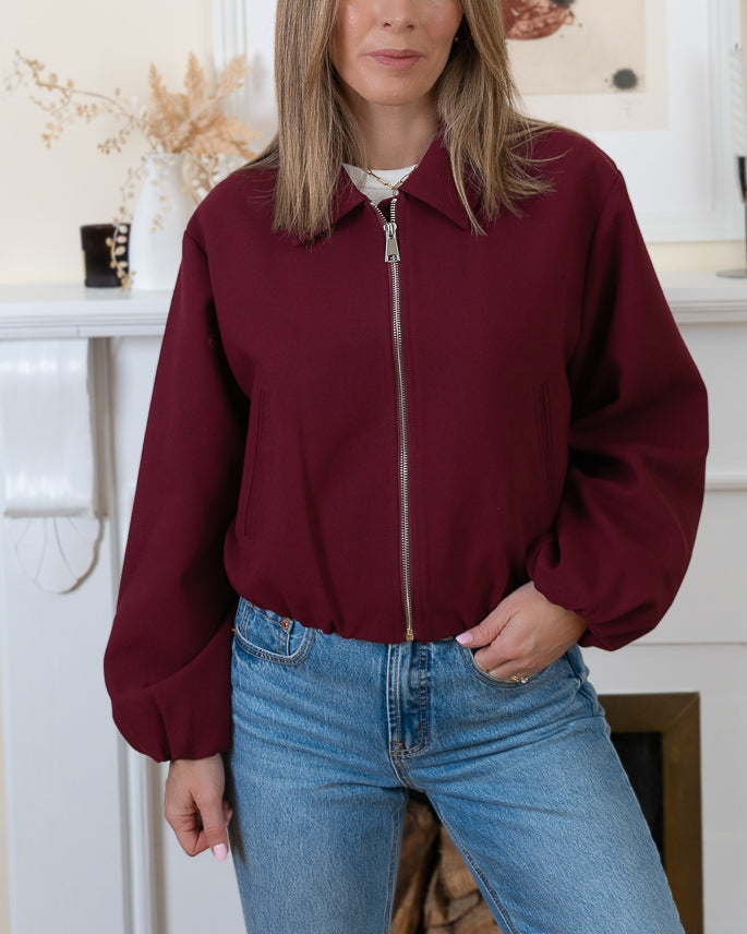 Wine bomber jacket with faux pockets, collars, buttons and zip closure.